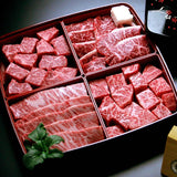 和牛の最高峰「神戸牛」から、焼肉に適した希少部位4種を選び抜いた「神戸牛 焼肉懐石」は、いわば神戸牛の宝石箱。松花堂をイメージした高級仕様の器に盛りつけ風呂敷にお包みし化粧箱にてお届けしますので、大切な来客へのおもてなし・ここぞというギフトにぴったりです。