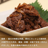| 原材料 | 佃煮(牛肉(兵庫県産神戸牛)、しょうが、しょうゆ、合成清酒、砂糖、水あめ/カラメル色素、調味料(アミノ酸等)、(一部に小麦・牛肉・大豆を含む))、 しぐれ煮(牛肉(兵庫県産神戸牛)、しょうゆ、みりん、合成清酒、砂糖、山椒加工品(実山椒、食塩)/カラメル色素、調味料(アミノ酸等)、酸味料(一部に小麦・牛肉・大豆を含む)) ※特定原材料(8品目):小麦 |
